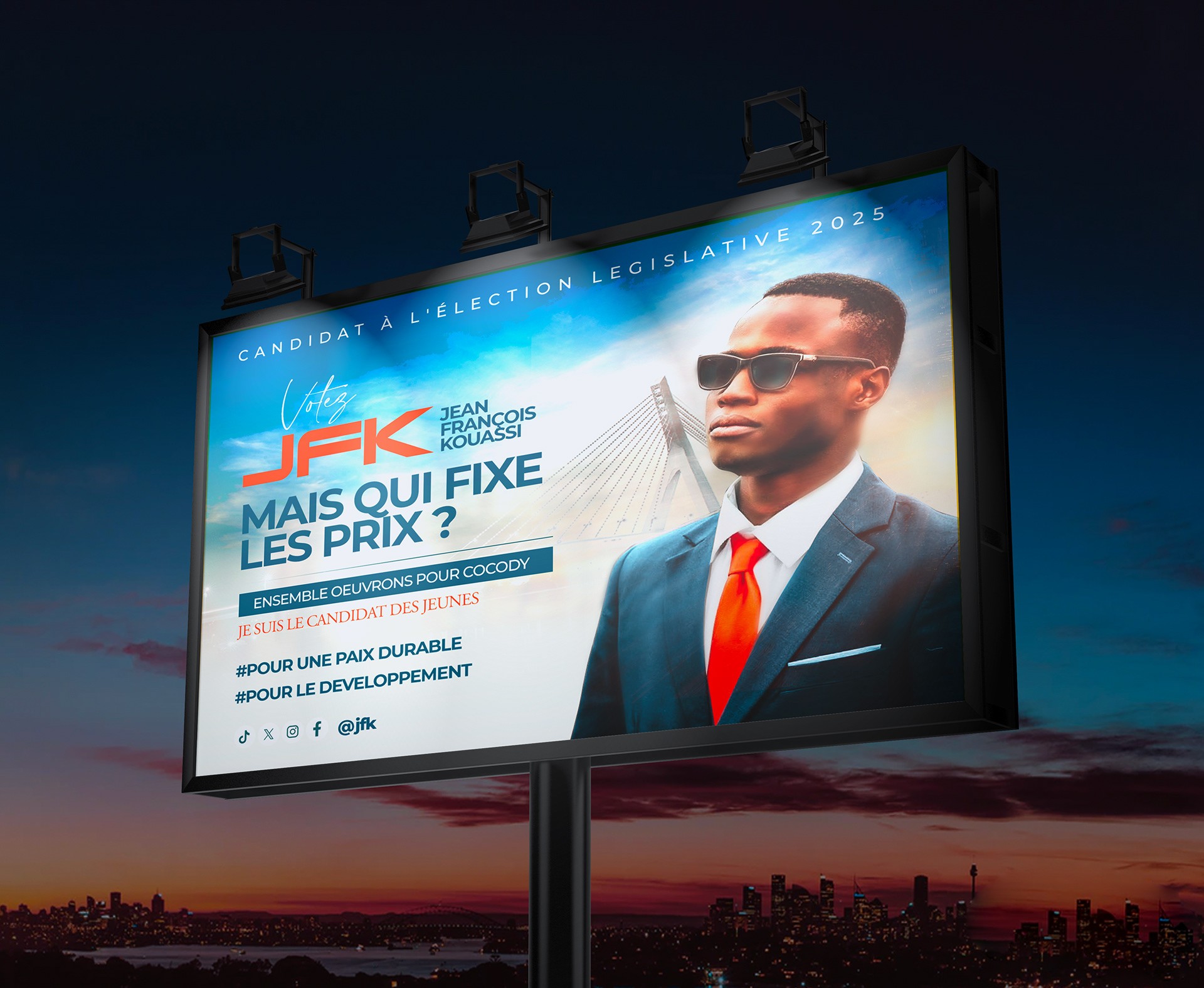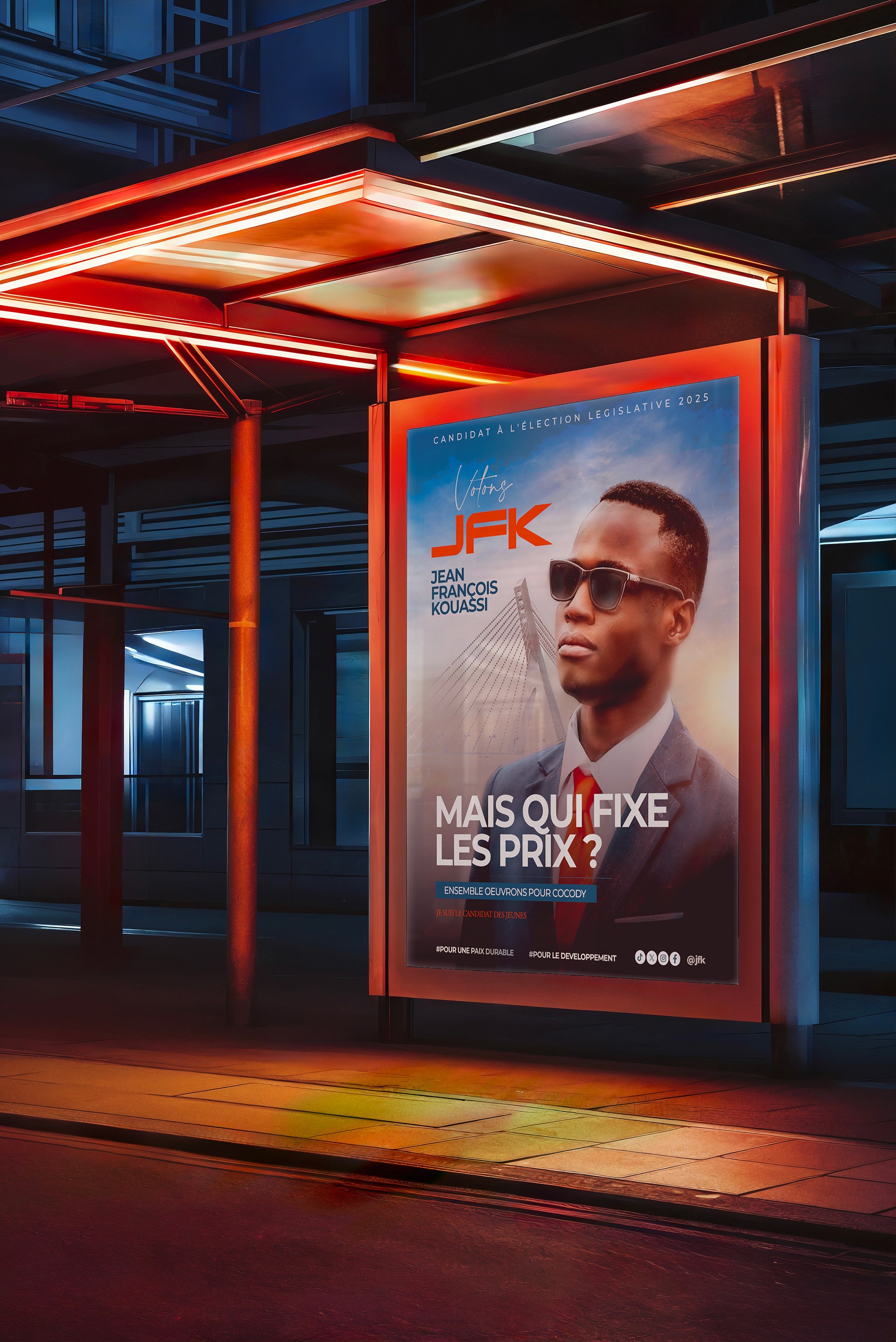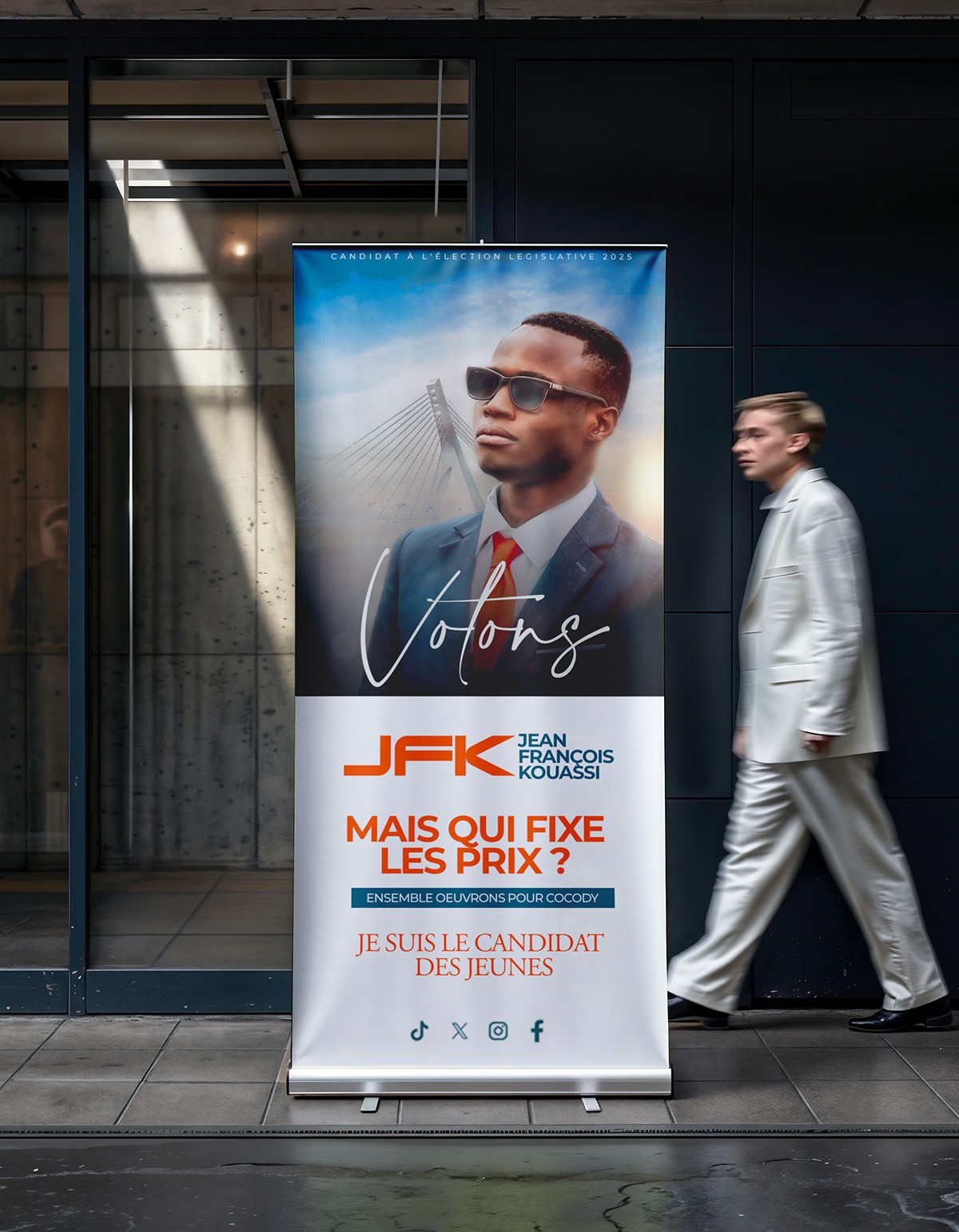 Le défi majeur de la campagne de Jean-François Kouassi (JFK) était de briser l'indifférence des jeunes électeurs face à une esthétique politique traditionnelle jugée vieillissante et déconnectée. Mon objectif était de concevoir un design qui ne ressemble pas à de la politique, mais à un mouvement de société, en utilisant les codes visuels que cette cible consomme quotidiennement.